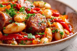 Hearty sausage, tender potatoes and beans in a rich tomato sauce. Comfort in a bowl — weeknight speed, weekend warmth.