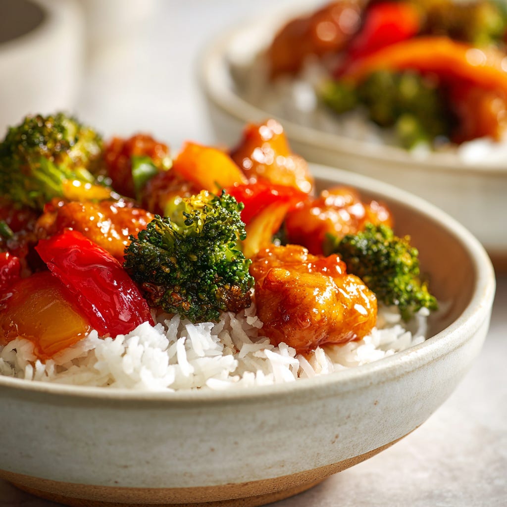 Share the rice between your bowls and top with the sweet and sour chicken.